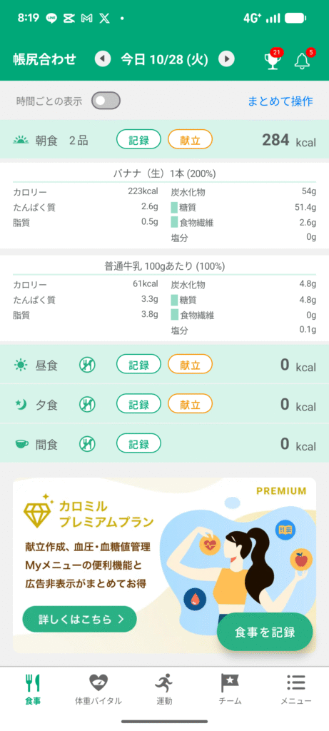 バナナ2本だと炭水化物に偏る。たんぱく質を朝から取って摂取カロリーを埋めたい。