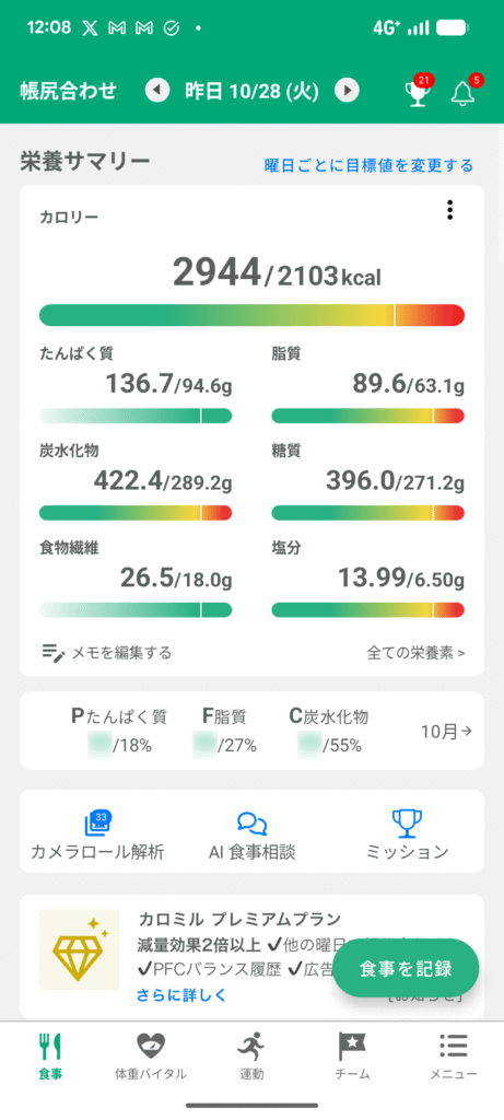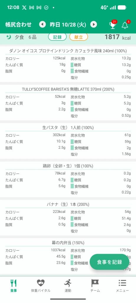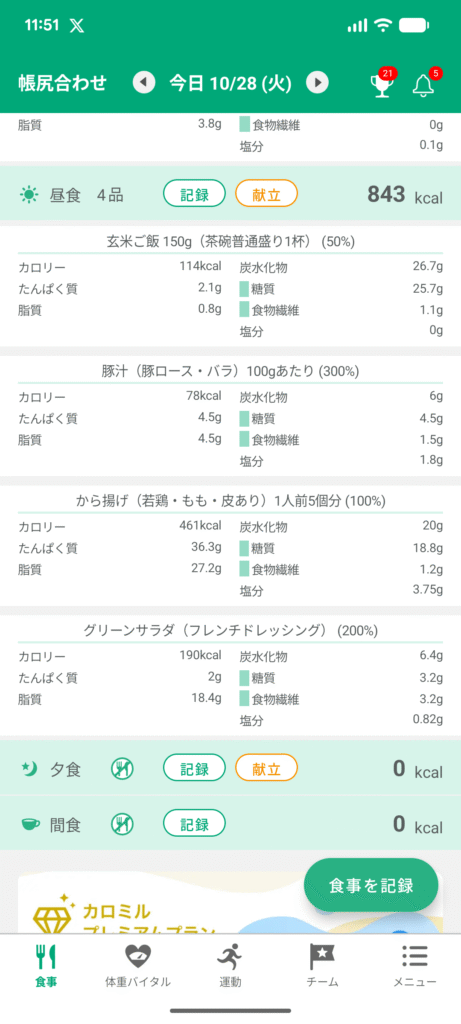 唐揚げなので脂質がすでに目標値を超えてしまった。夜の食事は脂質を抑えたい。